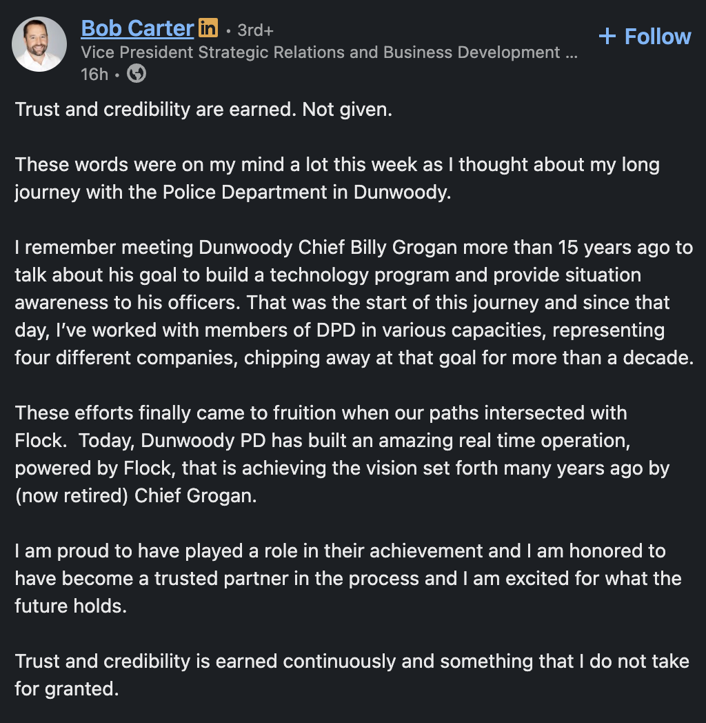 A few things have happened between then and now: the city attorney and Flock hammered out a master service agreement; I posted about the flawed security assessment, and about how Bob Carter and other Flock employees have been using their accounts in the Dunwoody system to track lawncare equipment deliveries.
