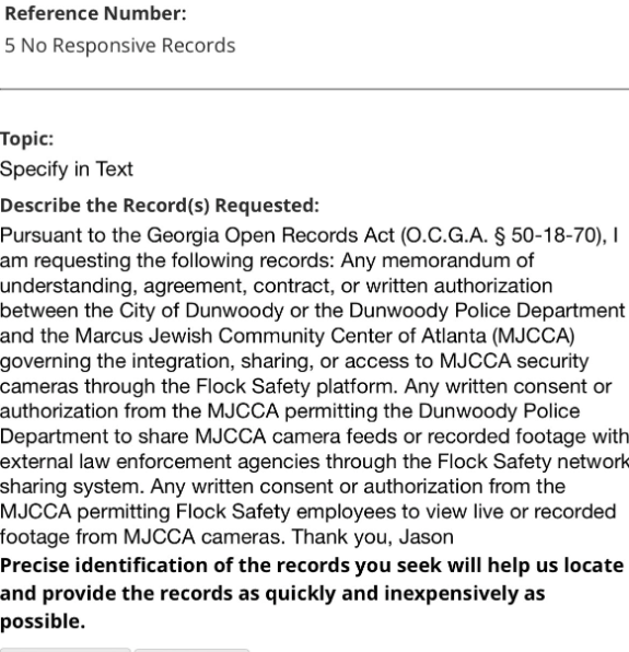 The network sharing is even worse. The JCC’s private camera network, labeled in Flock’s system “Dunwoody GA PD - Atlanta JCC Avigilon (Do Not Share),” was at one point actively shared by Dunwoody PD with three outside agencies, including Lawrenceville GA PD, which received permissions to view, record, and download live video streams.